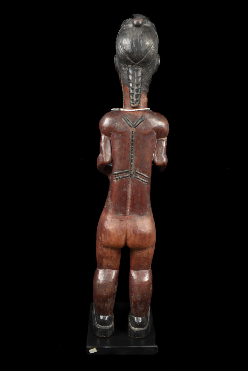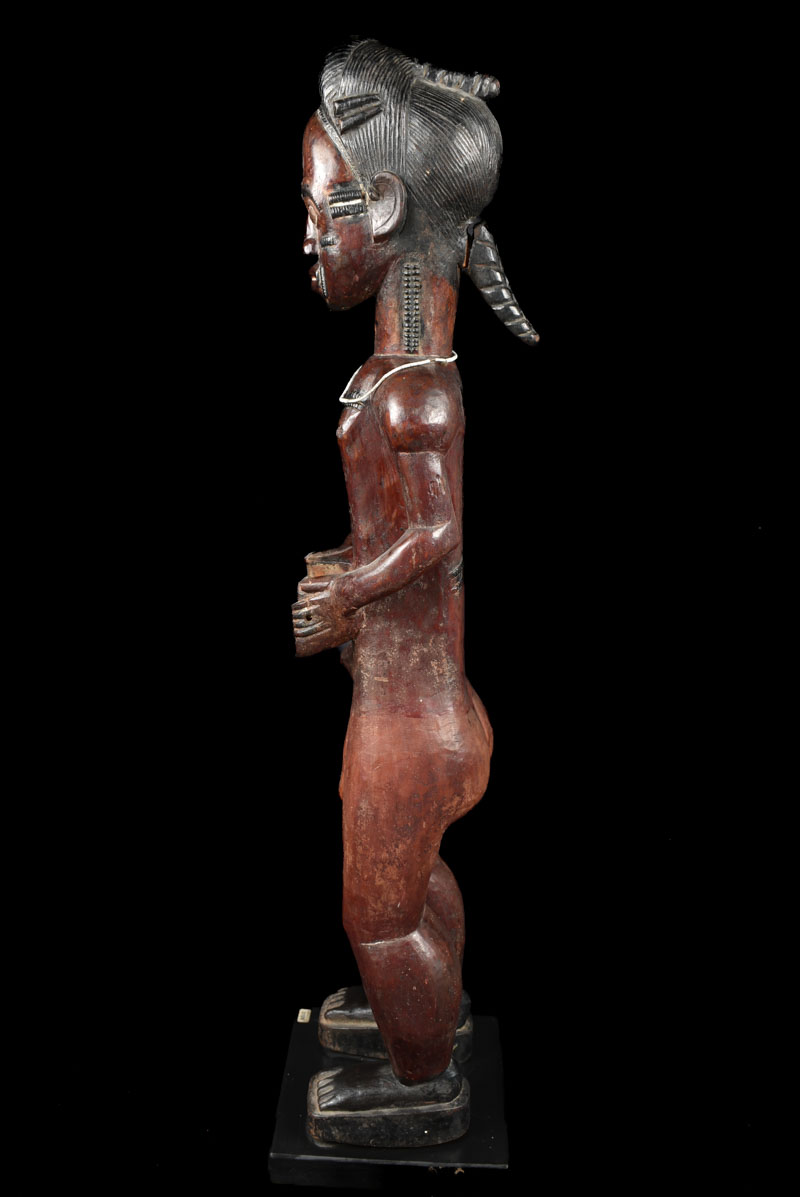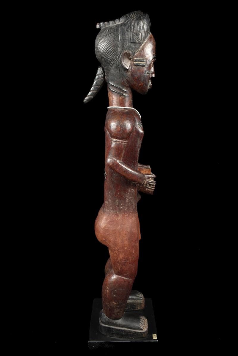 They are are known for their figures with hands resting on their abdomen in a gesture of peace, and their elongated necks supporting a face with typically raised scarification and bulging eyes.