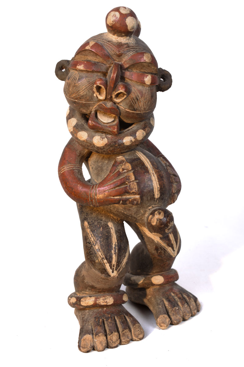 A complex, and detailed piece, the figure here is standing with hands open,Classic bulbous features characterize this wild whimsical sculpture The face, torso, limbs are impressed with multiple scarification patterns.