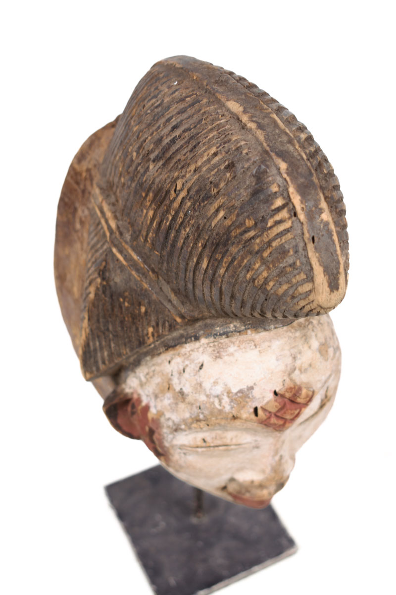 PUNU masks are thought to represent ancestors` faces. They are worn during funerals and by a Moukouji initiate who stands on stilts. This masks has a realistic face with protruding pursed lips, T-shaped nose, globular protruding eyes incised with a curve, high-dome forehead and characteristic ridged high coiffure, which reflect the PUNU women`s style.