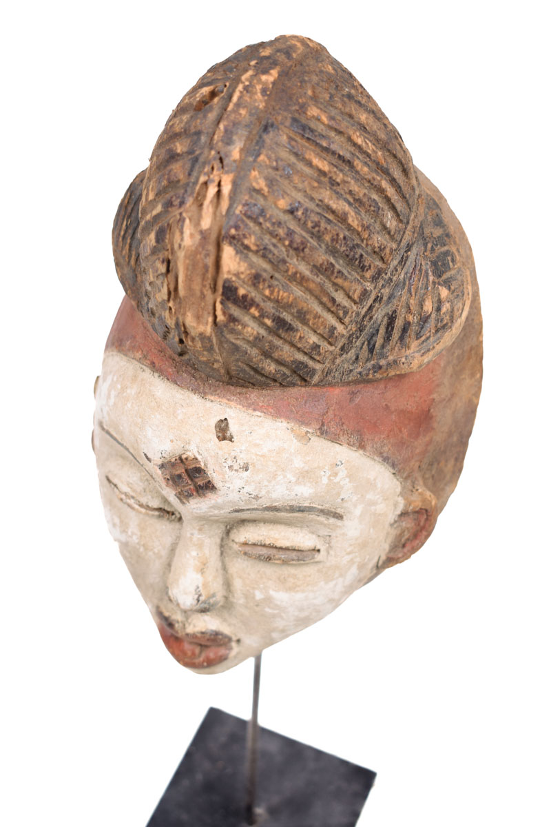 PUNU masks are thought to represent ancestors` faces. They are worn during funerals and by a Moukouji initiate who stands on stilts. This masks has a realistic face with protruding pursed lips, T-shaped nose, globular protruding eyes incised with a curve, high-dome forehead and characteristic ridged high coiffure, which reflect the PUNU women`s style.