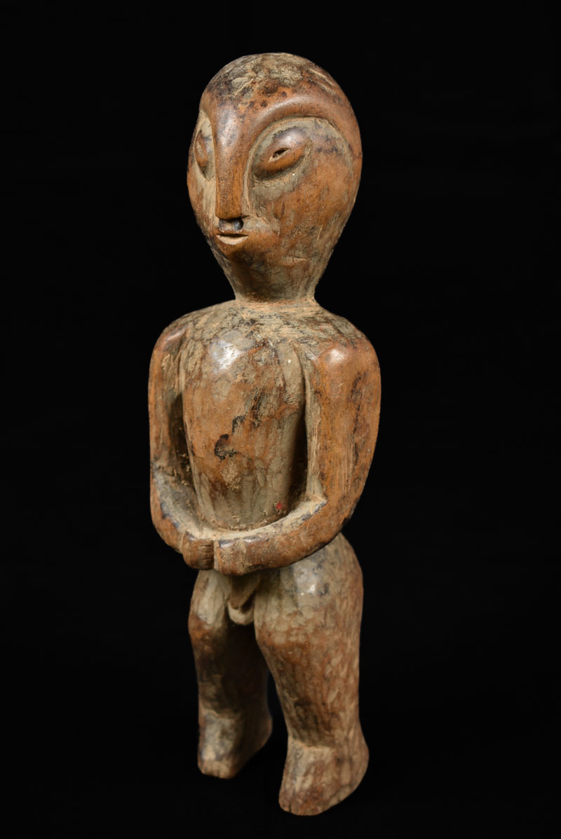 Powerful Lega initiation statue from DR Congo. These kind of statues were used in instruction and initiation ceremonies into the five progressive levels of Bwami, the association that Lega men rise through with lifelong learning and deeds. . Covered in Pembe, white clay, each time the statue was used, resulting in a beautiful patina. The figure is in good condition with traces of wear and tear.