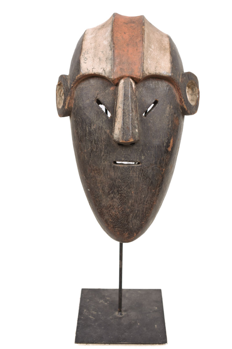 The JONGA are a small, ethnic group in the center of the Congo. They live south of the MBOLE. So far only very few of their masks and sculptures are known. This mask made of light wood shows the typical style characteristics of the JONGA: The extremely slanted, slit eyes are characteristic of the JONGA style. Nose and eyebrows are prominently and sublime worked, as well as dark brown colored, like the circumferential, outer, broad edge of the face mask.