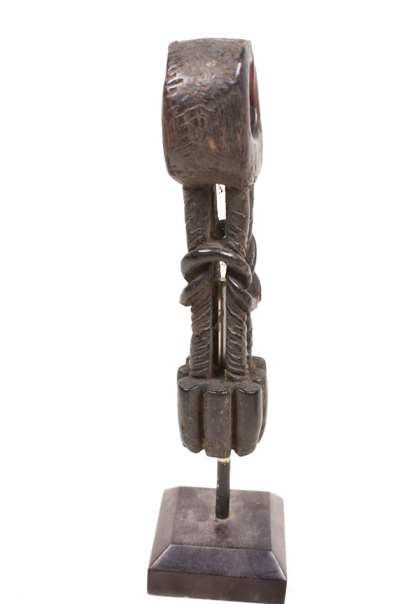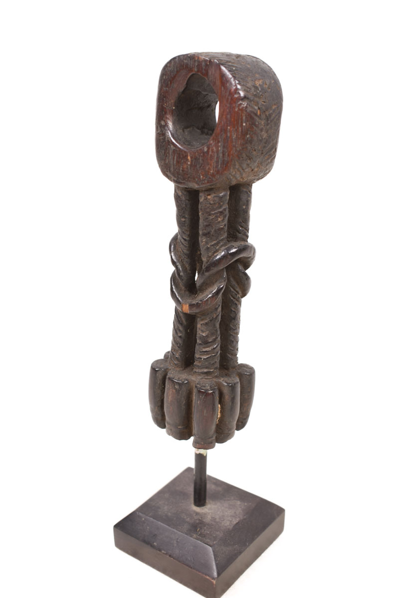 A ‘ghurra’ keeps the churning-rod on its place during the churning of the milk. The Hindu and Buddhist Nepali beliefs in the myth that ‘man & woman’ were created after the Gods churned the primal ocean. The ghurra depicts often scenes from daily life or can have beautiful abstract messages. Sometimes they are anthropomorphic, or phallic. Very often they obtain beautiful wear and patina, because of their intensive use. The huge variety and affordability of these objects, makes them an interesting collecting subject.