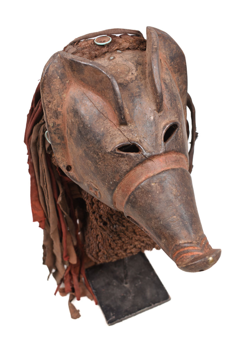 Exceptional pig mask from the CHOKWE tribe of Angola. The mask is made of wood and decorated with rope. It represents a domesticated pig that performs many tricks. These masks are used during magical dance rituals in which the dancer is on all fours and moves the mask forwards.
