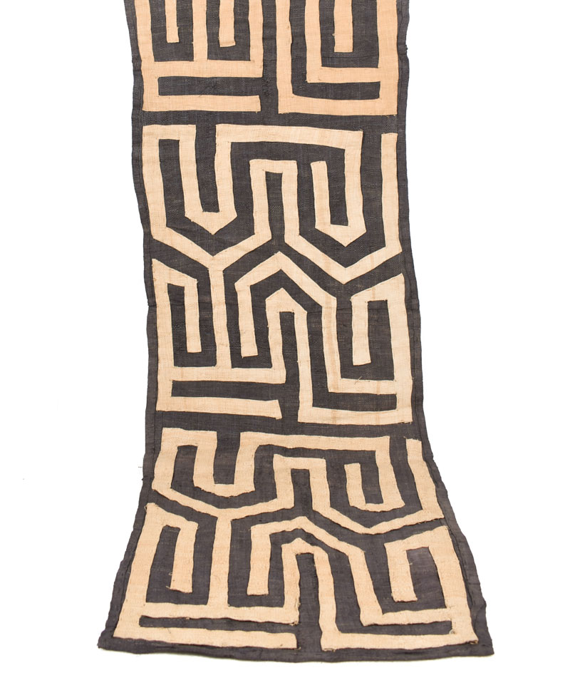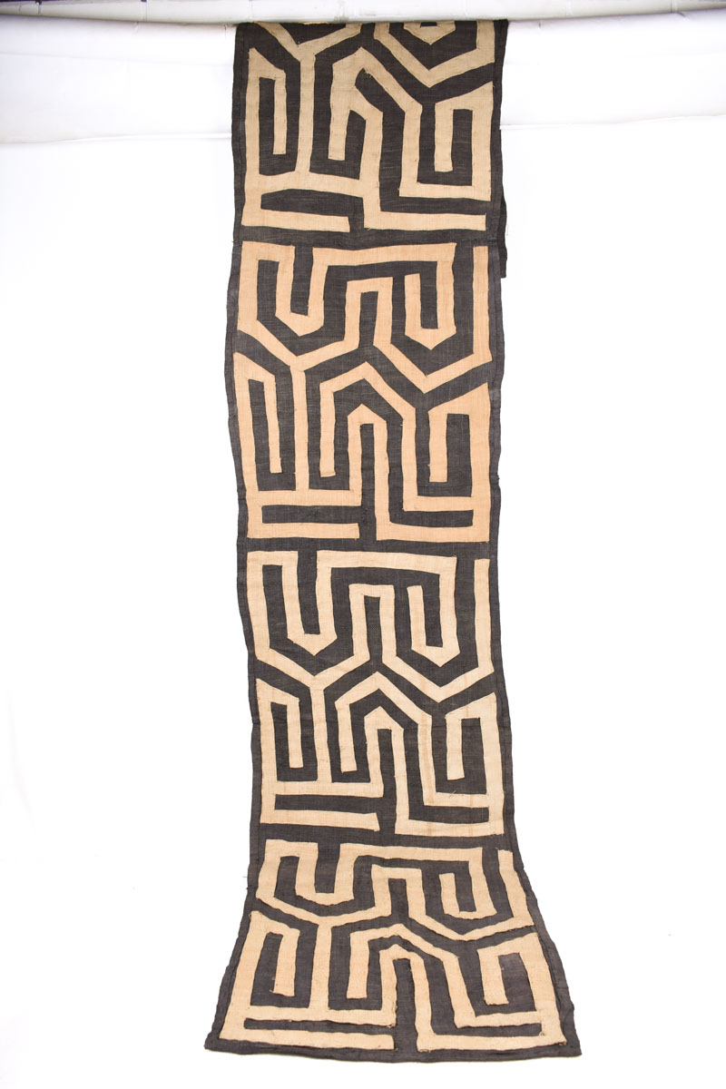 Kuba skirts, Tcaka, long are cloths made from raffia, from 8 – 25 feet long, from the Ngeende, Bushoong and Ngongo peoples. They incorporate appliqued “patches”, embroidered shapes and patterns, openwork, tie-dye, cowrie shells, barkcloth and border elements. The appliqued “patches” originally repaired holes, then developed into traditional design motifs. .Most are covered with geometric symbols; many are restrained, subtle and rhythmic designs using one technique; others create amazing quilt-like assemblages of old pieces of many forms. The full skirts, worn by men and women, are bunched up and wrapped around many times.