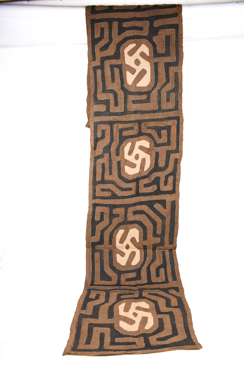 Kuba skirts, Tcaka, long are cloths made from raffia, from 8 – 25 feet long, from the Ngeende, Bushoong and Ngongo peoples. They incorporate appliqued “patches”, embroidered shapes and patterns, openwork, tie-dye, cowrie shells, barkcloth and border elements. The appliqued “patches” originally repaired holes, then developed into traditional design motifs. .Most are covered with geometric symbols; many are restrained, subtle and rhythmic designs using one technique; others create amazing quilt-like assemblages of old pieces of many forms. The full skirts, worn by men and women, are bunched up and wrapped around many times.