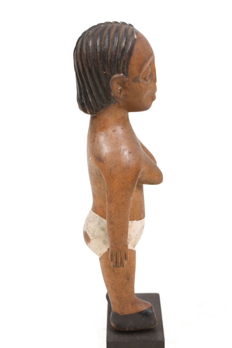 A fine venavi figure made out of wood. This miniature is used as a doll among the Ewe people. The Ewe people of Ghana celebrate the birth of twins as a good omen. Twins known as Venavi, lead a life of parallel experiences as they are fed, bathed, and similarly dressed.However if one of the twins dies a Venovi figure is purchased to represent the deceased twin and is equally maintained as though alive, being washed and fed.Like the well-known Ibeji of the Yoruba that represent the same idea of portraying the deceased twin in a sculptural form, Ewe dolls are shown as adults and represent deceased twins.They are delightful miniature carvings and have a place in any collection for their carving and presence and for what they represent.